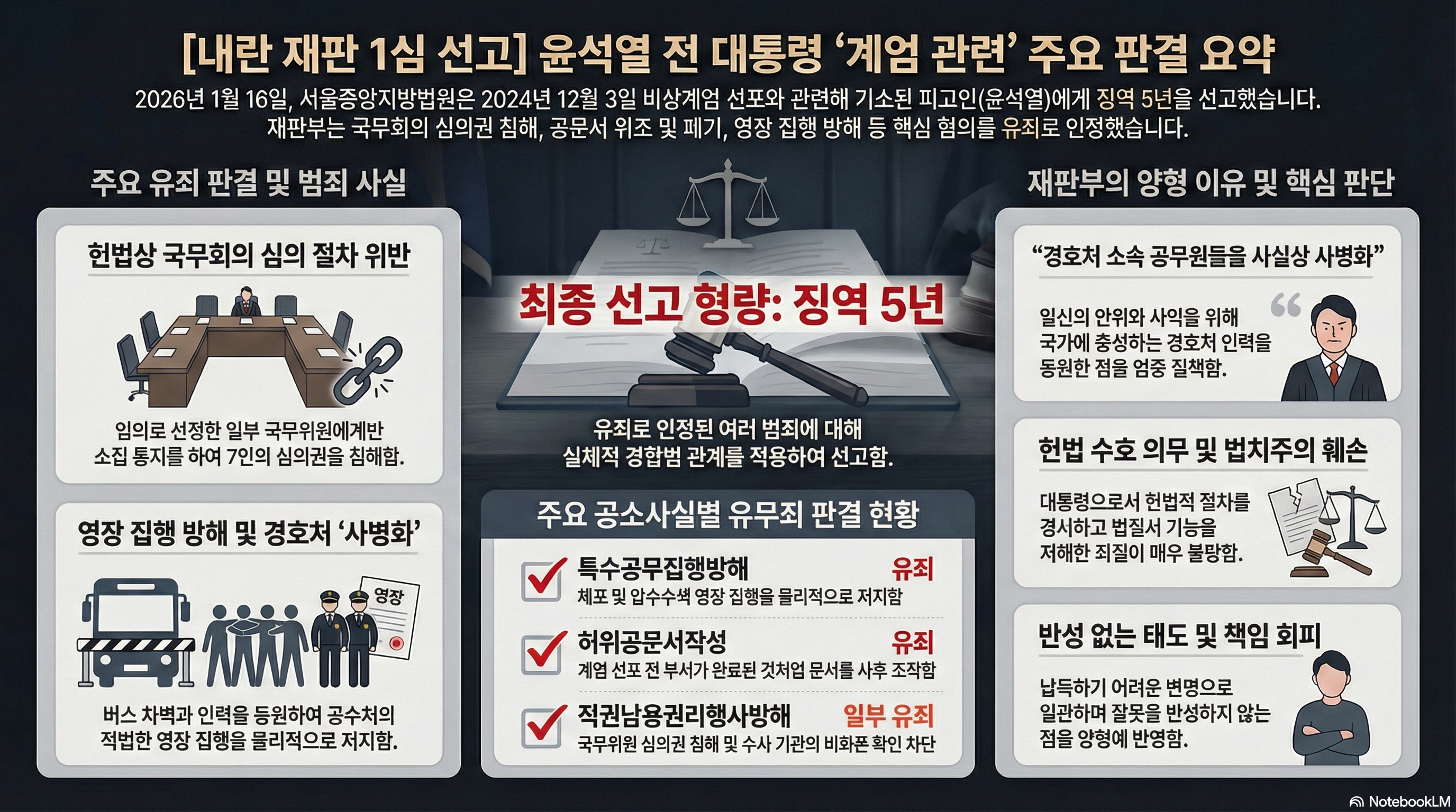 대한민국 헌정사에 길이 남을 순간이 찾아왔습니다. 서울중앙지방법원 형사합의부는 2025고합1010호 사건, 즉 윤석열 전 대통령에 대한 1심 선고 공판에서 징역 5년의 실형을 선고했습니다. 재판부는 "대통령으로서 누구보다 헌법을 수호하고 법질서를 준수할 의무가 있음에도 절차적 요건을 경시하고 공권력을 사병화했다"며 엄중한 심판을 내렸습니다.